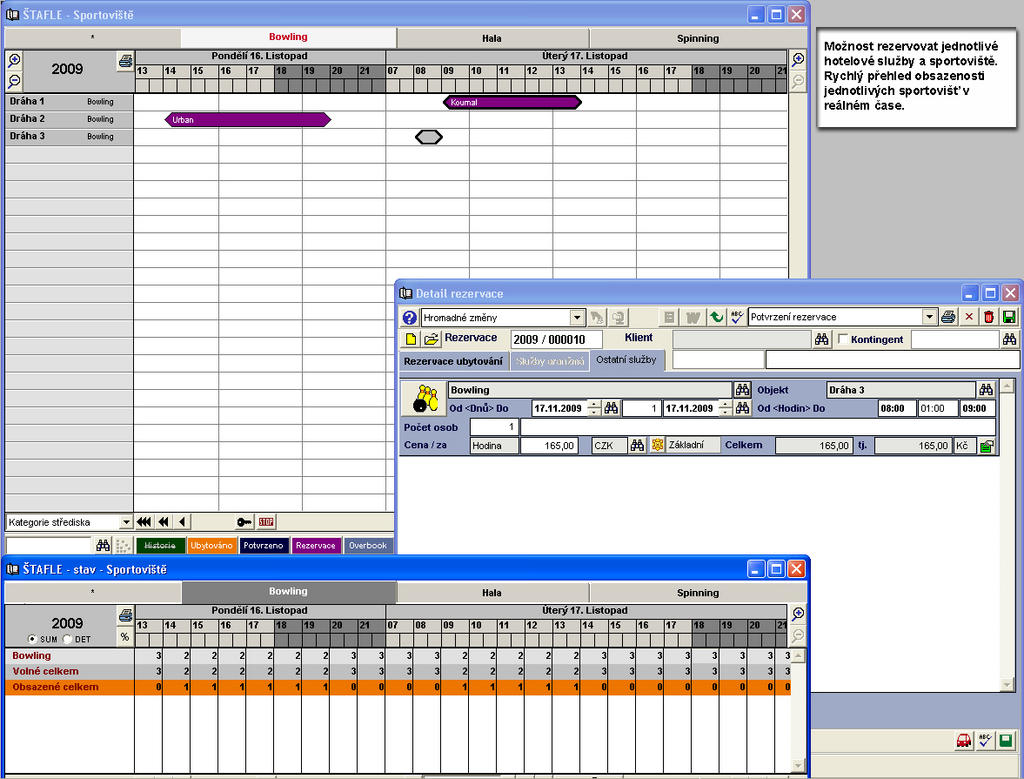 Přehledný rezervační systém, který funguje na principu hotelové recepce, čímž Vám usnadní přehled a správu dostupných pokojů, sportovišť, aj.