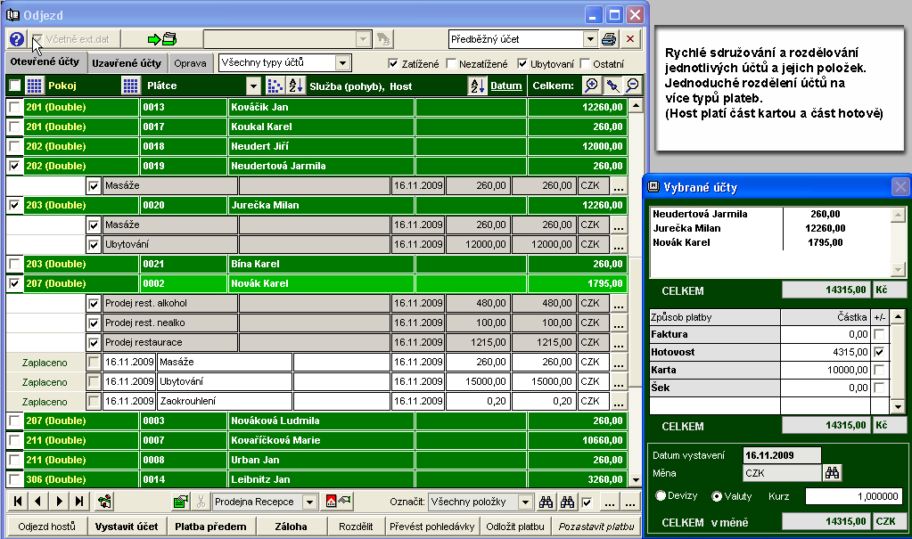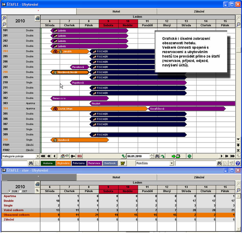 Hotelový software sleduje stav pokojů, obsazenost, odstávky a umožňuje veškeré činnosti spojené s pobytem hosta. (změna délky pobytu, stěhování pokojů i jednotlivců, zařazování do skupin, vyřazení ze skupiny, změny cenových aranžmá atd...). Vystavování účtů hostů a jejich navyšování lze provádět kdykoli a to jak před příjezdem formou zálohové platby, během pobytu nebo i po odjezdu hosta formou odložené platby.