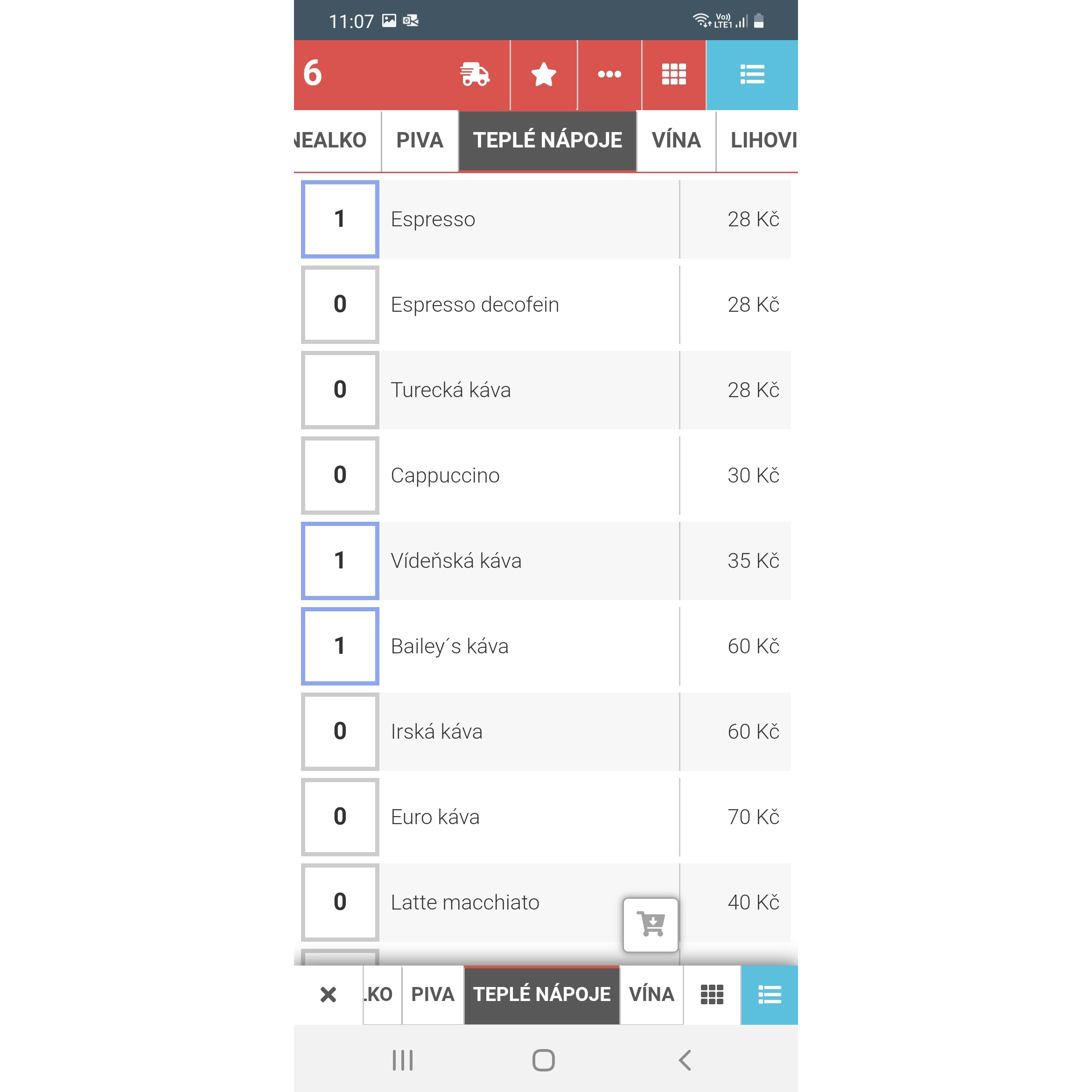 - Menu aplikace obsahuje především výpis vystavených účtenek, které je možno stornovat, dotisknout nebo změnit typ platby