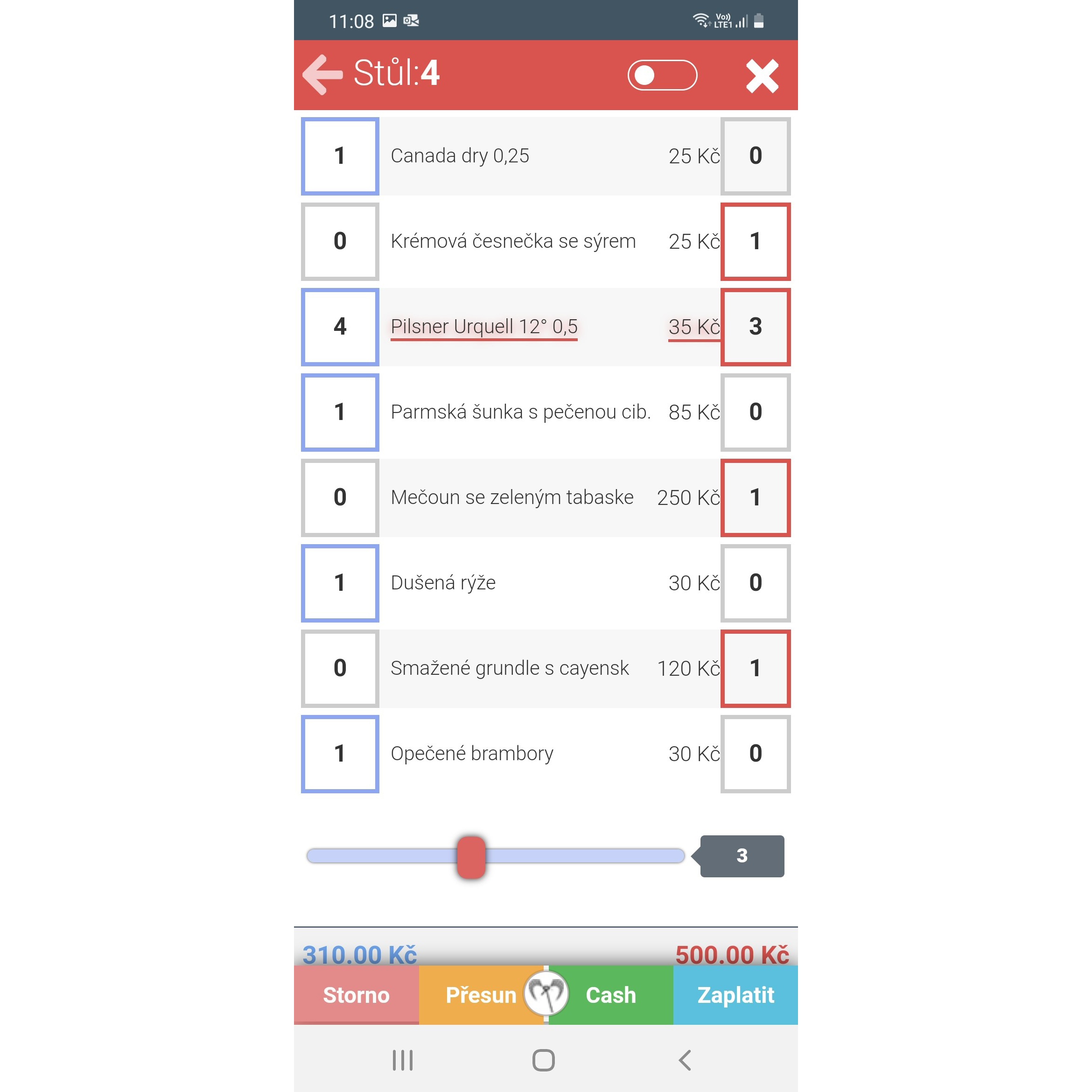 - Každý stůl obsahuje náhled namarkovaných položek + dvě ovládací tlačítka pomocí kterých voláme funkce pro markování potažmo pro práci s již namarkovanými položkami (platba, storno, přesun)
