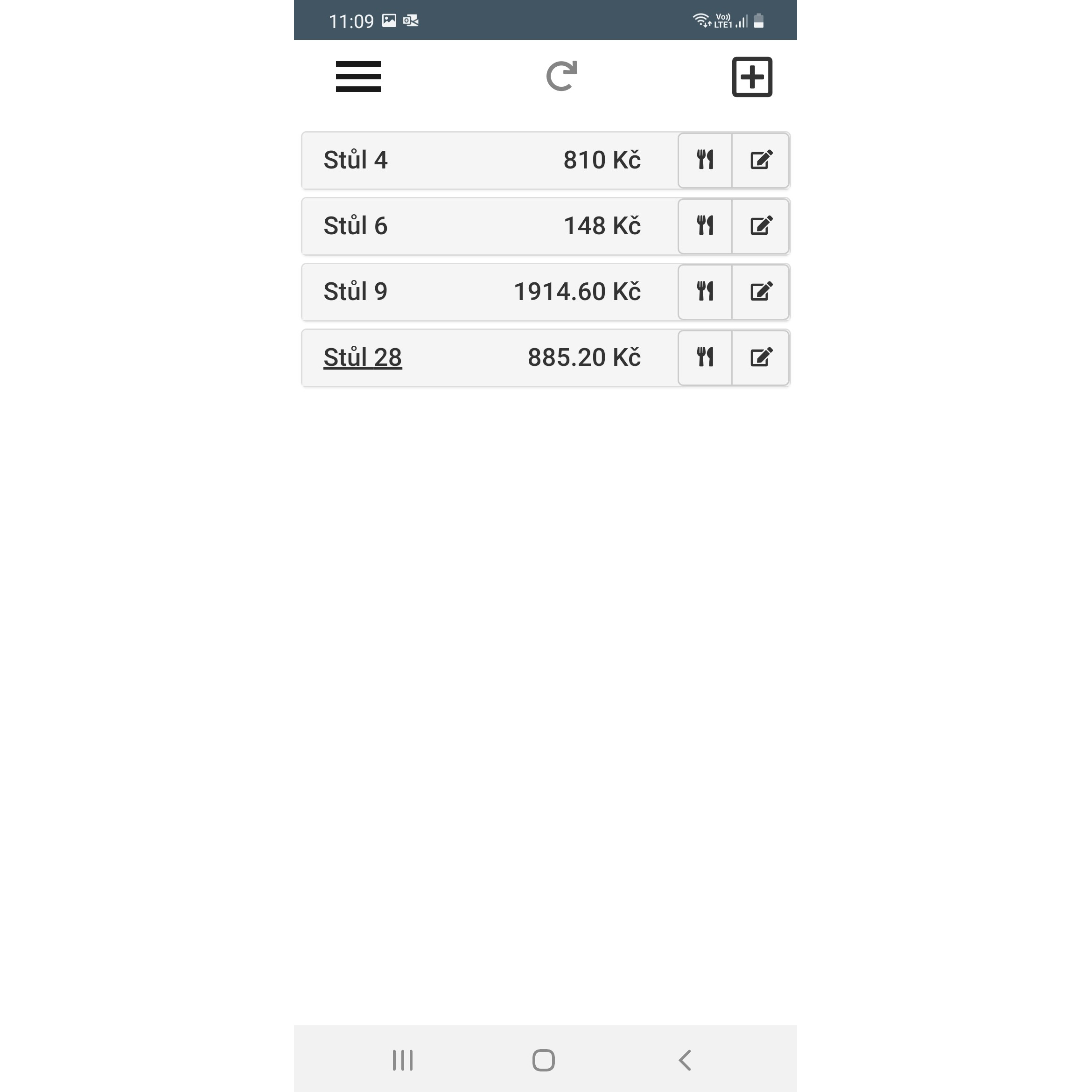 - V tlačítkové liště se nachází tlačítka menu aplikace, znovu načtení otevřených stolů a tlačítko pro otevření nového stolu